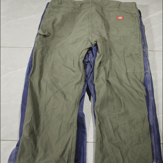 Vores Dickies Oversized Trousers-balle indeholder en blanding af tømrerbukser, cargobukser, arbejdstøjsbukser og jeans i forskellige farver og stilarter.