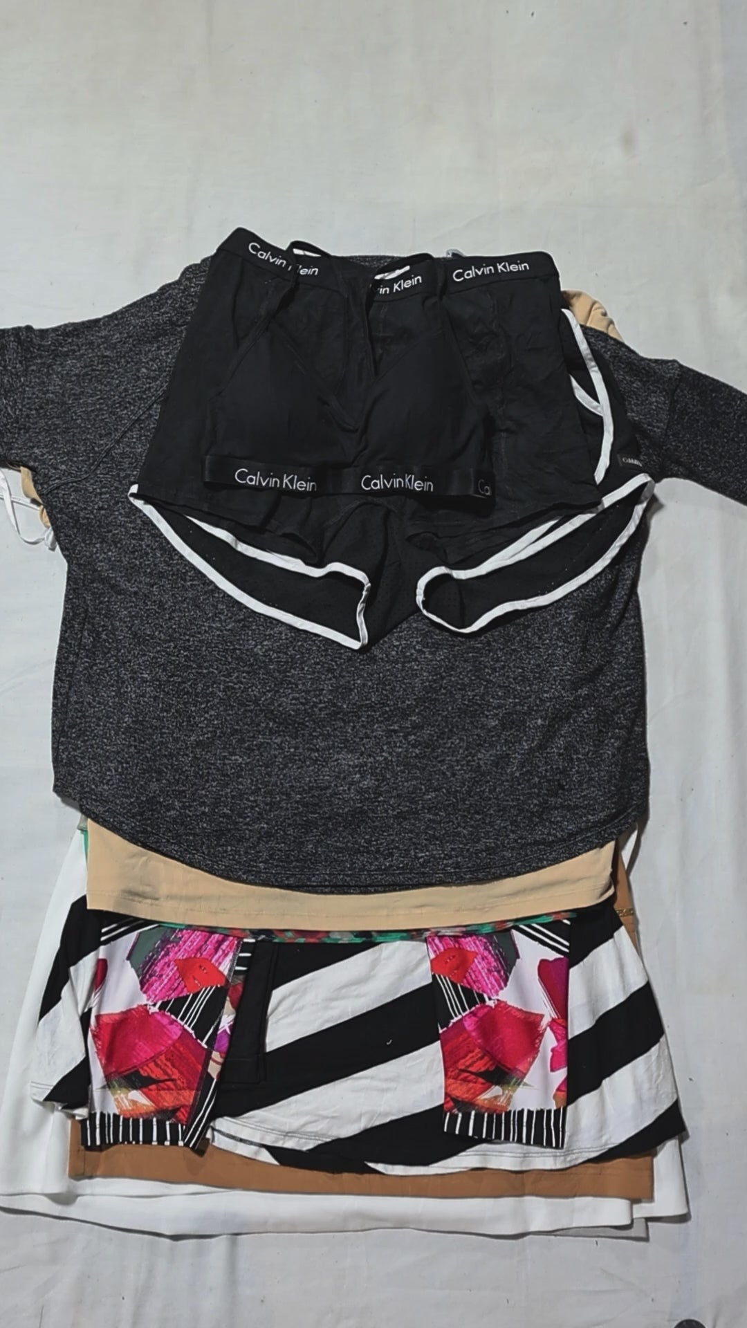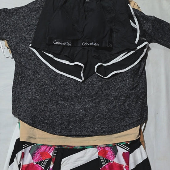 The Calvin Klein Women's Mix Bundle includes womenswear such as leggings, tops, hoodies, and undergarments in various sizes, styles, and colours. It might include menswear as well.